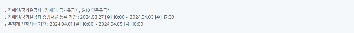 ( 장애인 ,국가유공자 ) 등록 및 증빙서류 필요 -- 2024. 03.27 -10:00 ~ 2024, 04. 03 -17 :0