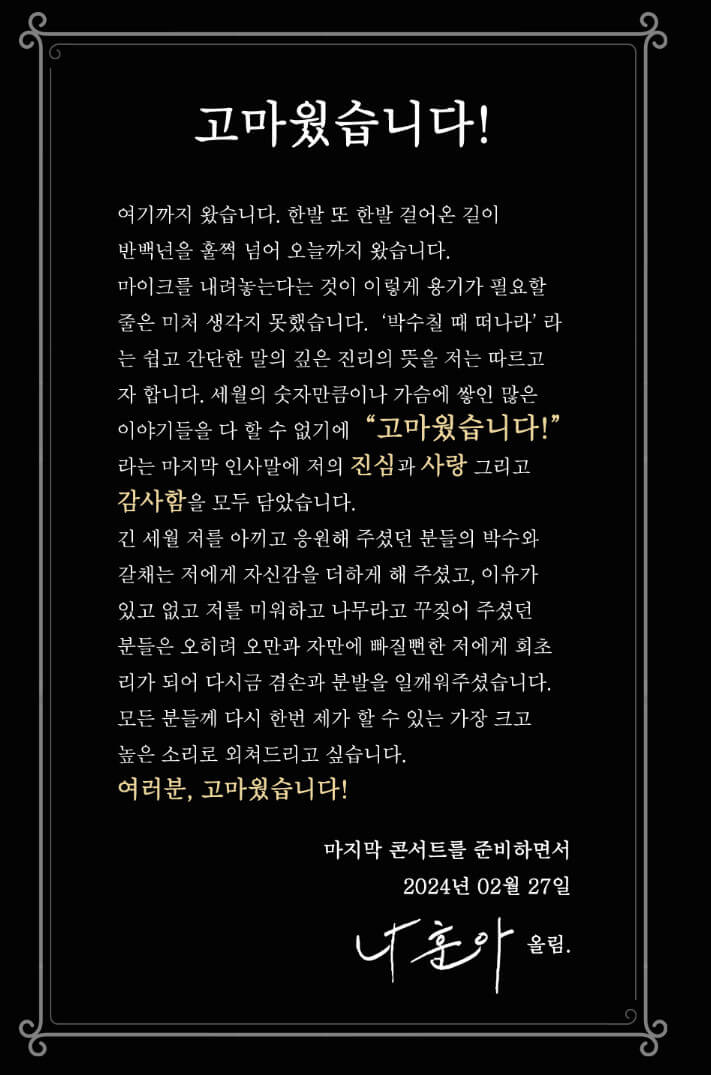 2024년 하반기 나훈아의 은퇴 전 ' 고마웠습니다 ' 편지글과 함께 마지막 콘서트 일정이 공개 되었습니다. 일정을 잘 참고하시고 빠른 매진이 예상되오니 미리 회원가입을 해두시고 나훈아 마지막 콘서트 티켓팅에 성공하시길 바랍니다.