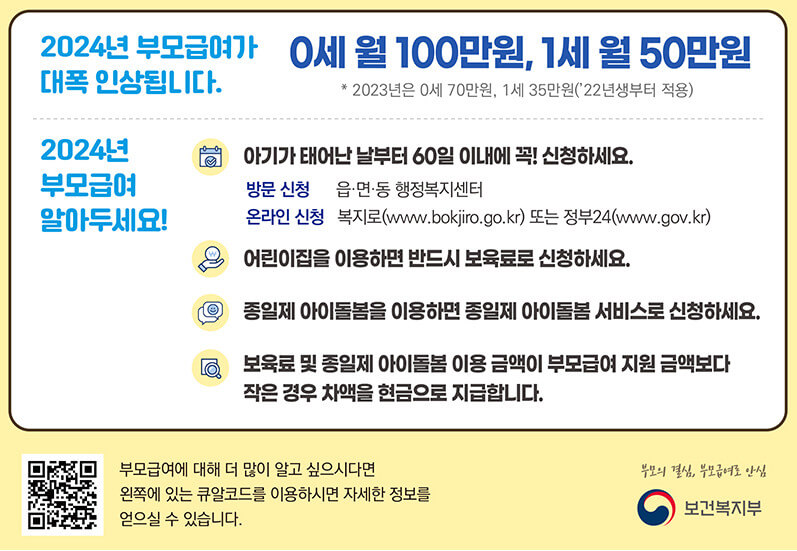 2024년부터는 출산 및 양육으로 인한 가정의 경제적인 손실되는 소득을 보전하기 위해 아동발달 특성을 고려하여 영아기 돌봄을 지원하기 위한 정부 혜택으로 0세 기준 월 100만원을 지원 받을 수 있는 ' 행복출산 원스톱 서비스' 를 신청하실 수 있습니다. 신청방법을 확인하시고 바로 신청하시고 꼭 지원 받으시길 바랍니다 .