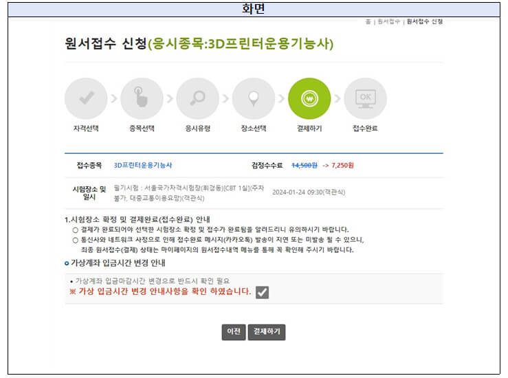 ● 기능사 필기시험 응시료 지원 시 : 14,500원의 50%인 7250원만 결제